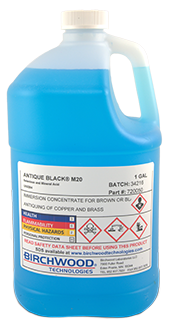 A general-purpose Blackening and Browning concentrate for brass, bronze and copper alloys. Rapid reaction makes M20 ideal for use on manual finishing lines. Contains buffering agents which make the solution resistant to low level contamination or carry-over without affecting finish color or coverage. Use at 20% by volume for Black finishes; 10-15% for a full range of pleasing Brown tones.